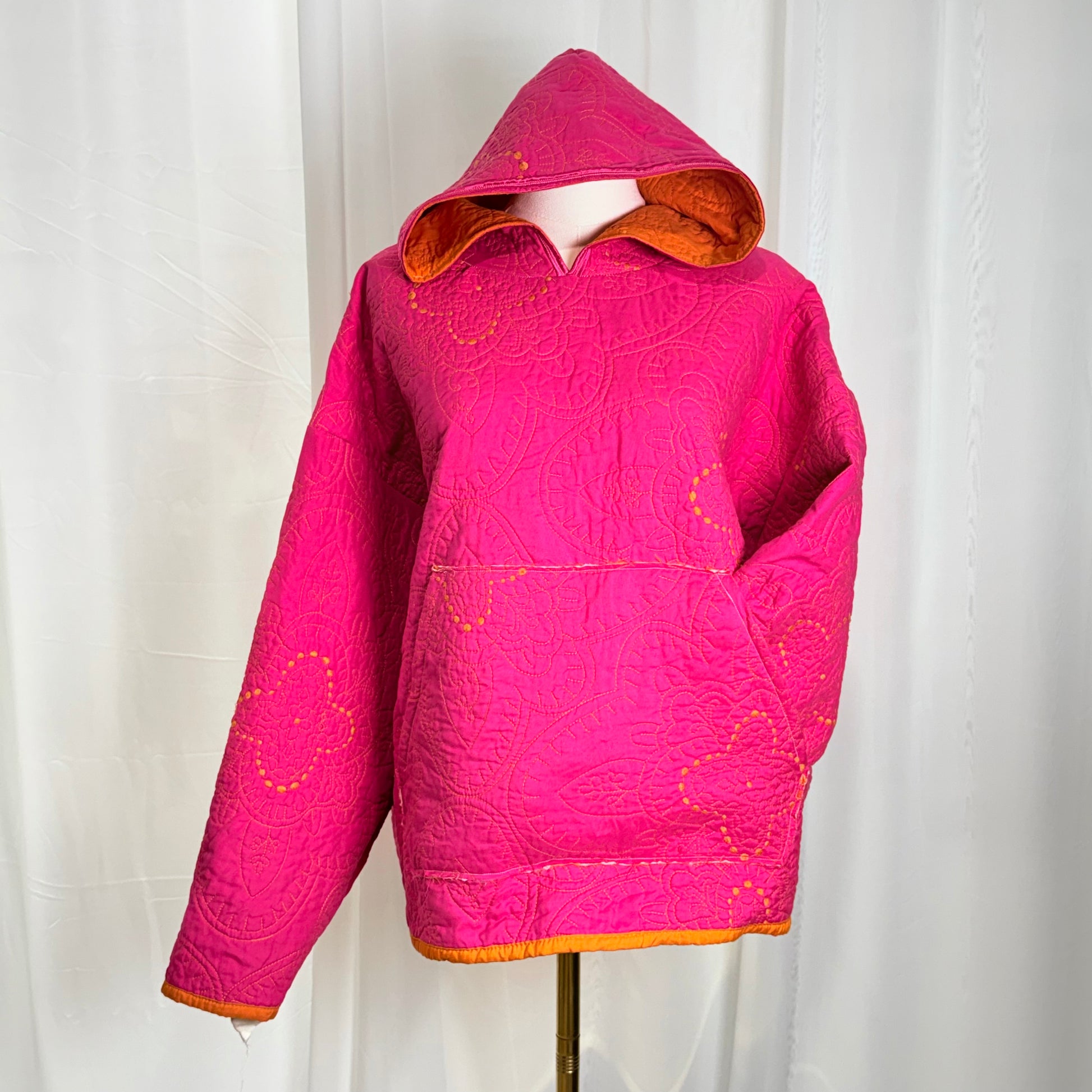 Wrap yourself in comfort and style with this one-of-a-kind handcrafted quiltoodie. Made from soft quilted fabric, it combines the warmth of your favorite blanket with the everyday ease of a hoodie. Perfect for lounging at home, running errands, or layering on chilly evenings, this hoodie brings a touch of handmade charm to your wardrobe.